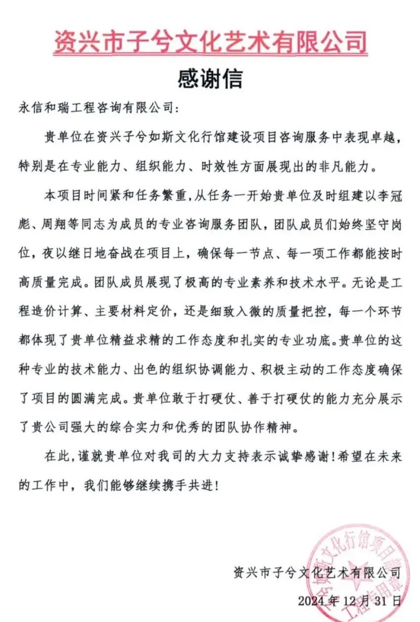 資興市子兮文化藝術有限公司對大灣區深圳分公司所提供的服務給予高度評價,對我司在專業能力、組織能力、時效性方面展現的非凡能力表示贊賞,并對我司的大力支持表示誠摯感謝。未來我司將在造價咨詢這一傳統優勢領域繼續深耕,延續一以貫之的硬實力、高水準,進一步在更多不同地區擴展業務版圖。