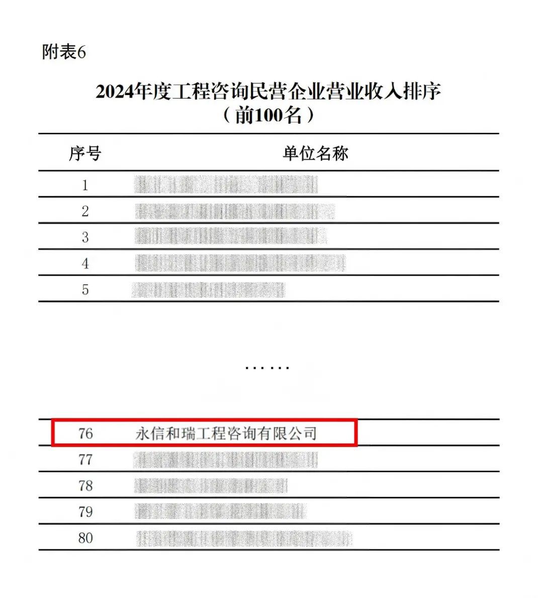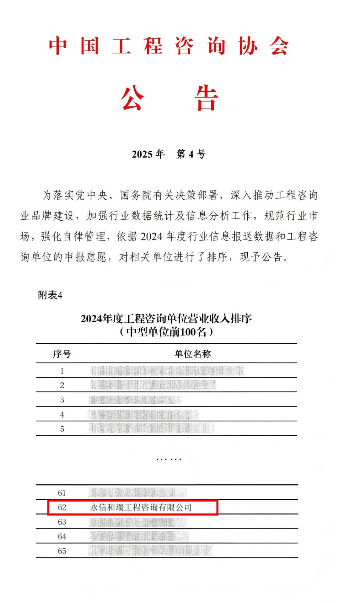 永信和瑞在本次排名中表現突出,位列工程咨詢民營企業營業收入100強榜單76位、中型單位營業收入100強62位。