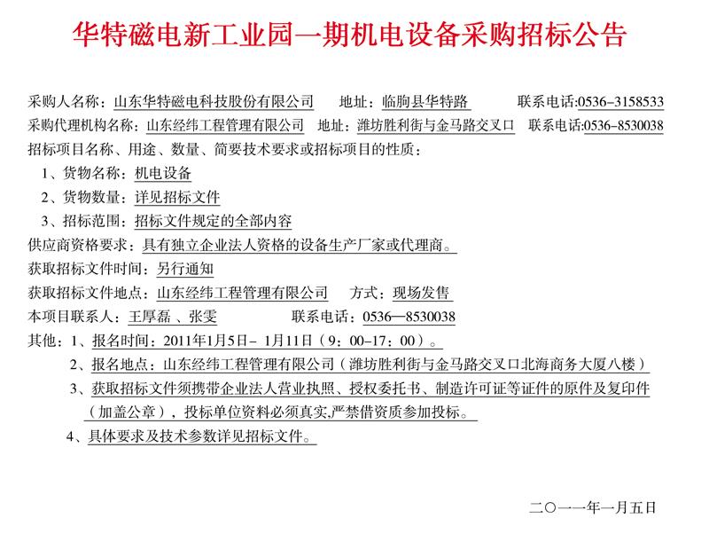 華特磁電新工業園一期機電設備采購招標公告