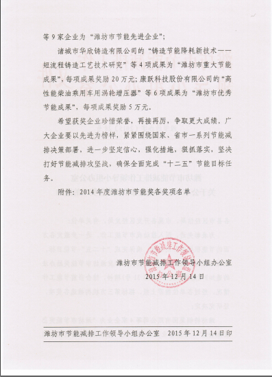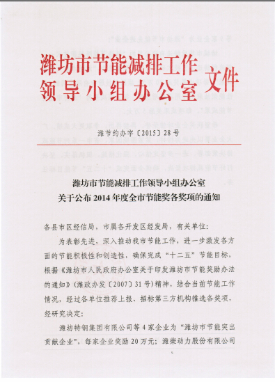 近日濰節(jié)約辦字[2015]28號文件和濰財企字[2015]28號文件下達了2015年度濰坊市節(jié)能獎的相關(guān)通知,我公司自主研發(fā)的發(fā)明專利產(chǎn)品提精降渣磁選機獲節(jié)能獎優(yōu)秀節(jié)能成果,獎勵資金5萬元。此次獲評是對提精降渣磁選機的充分肯定,該產(chǎn)品與電磁淘洗機串聯(lián)使用成功代替了反浮選工藝,省去了藥物除硅環(huán)節(jié),節(jié)能環(huán)保效益顯著。該產(chǎn)品項目2014年列入山東省科技發(fā)展計劃,2015年5月通過了新產(chǎn)品鑒定,技術(shù)達到國際領(lǐng)先水平,目前該產(chǎn)品已實現(xiàn)大批量產(chǎn)業(yè)化生產(chǎn),年產(chǎn)200臺套提精降渣磁選機生產(chǎn)線項目已列入濰坊市重大謀劃項目。