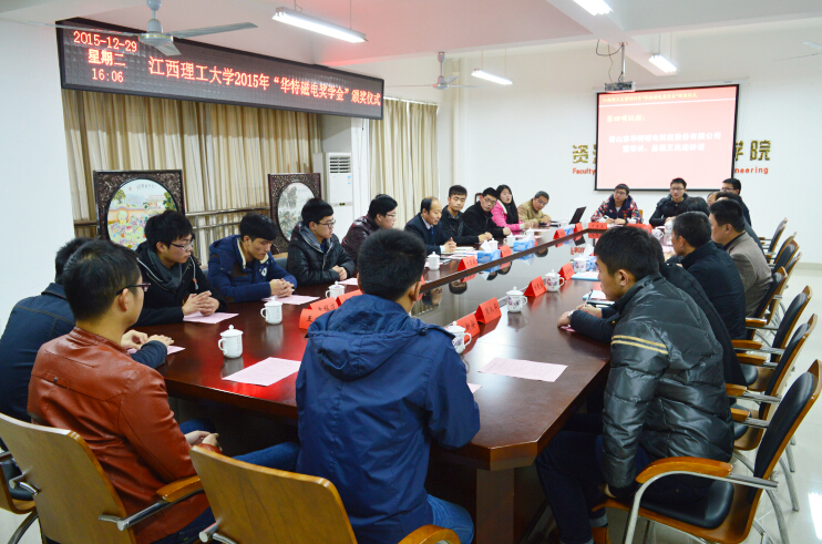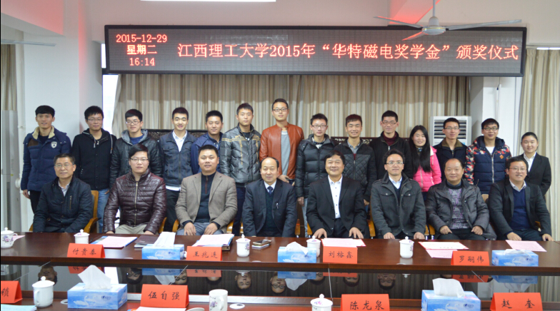 2015年12月29日,江西理工大學(xué)2015年度“華特獎(jiǎng)學(xué)金”的在江西理工大學(xué)黃金校區(qū)逸夫?qū)嶒?yàn)樓第一會(huì)議室舉行頒獎(jiǎng)儀式,山東華特磁電科技股份有限公司董事長王兆連、濰坊新力超導(dǎo)磁電科技有限公司選礦實(shí)驗(yàn)室主任付貴泰應(yīng)邀出席,江西理工大學(xué)副校長伍自強(qiáng)教授、校團(tuán)委書記、學(xué)工部副部長汪鋒鎖、研究生院院長助理陳龍泉、資環(huán)學(xué)院黨委書記楊建永、院長趙奎、院黨委副書記熊淑華、2015年度“華特磁電獎(jiǎng)學(xué)金”的全體獲獎(jiǎng)同學(xué)參加了本次儀式。