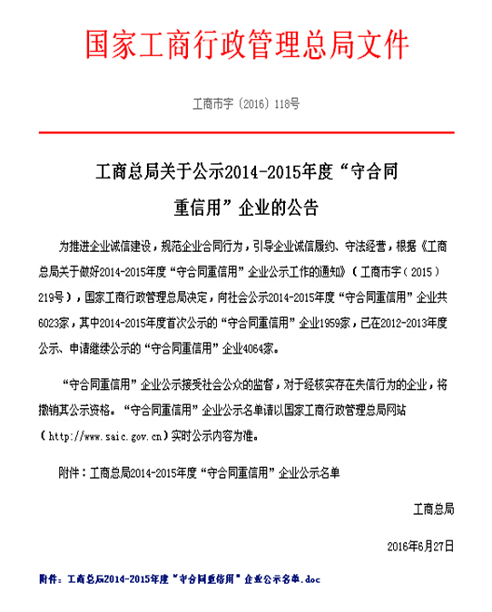 近日國(guó)家工商行政管理總局以工商市字(2016)118號(hào)發(fā)布了工商總局關(guān)于公司2014-2015年度“守合同重信用”企業(yè)的公告,華特公司名列其中。近年來華特公司積極推進(jìn)誠信建設(shè),嚴(yán)格規(guī)范合同行為,誠信履約、守法經(jīng)營(yíng),得到了上級(jí)主管部門和客戶的一致好評(píng),一直是山東省“守合同重信用”企業(yè),本次列入國(guó)家級(jí)“守合同重信用”企業(yè)是對(duì)公司規(guī)范化管理的肯定,將進(jìn)一步推動(dòng)企業(yè)的快速發(fā)展,促進(jìn)企業(yè)向國(guó)際領(lǐng)先的磁力應(yīng)用系統(tǒng)服務(wù)商邁進(jìn)。