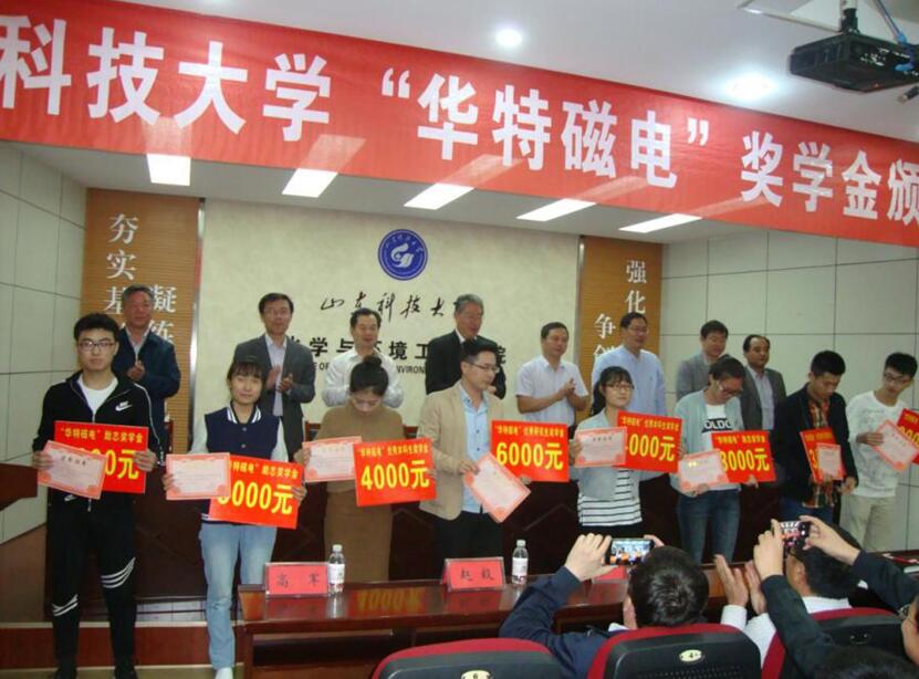 2016年9月28日,值山東科技大學65周年校慶之際,公司常務副總經(jīng)理、磁電聯(lián)盟秘書長劉風亮一行,赴山東科技大學頒發(fā)“華特磁電”獎學金并作為理事單位參加了山東省科技大學理事會成立大會?!?br/> 根據(jù)公司與山東科技大學簽訂的“華特磁電”獎學金使用辦法,本次獎學金發(fā)放給化學與環(huán)境工程學院的在校學生。這是公司在山東科技大學頒發(fā)的第二屆“華特磁電”獎學金。山東科技大學黨委副書記李道剛,學生工作部、校團委、教務處、合作發(fā)展處、化工學院負責人出席會議,會議由化工學院黨委副書記竇存增主持。獲獎學生以及礦物加工工程系教師、研究生、本科生代表參加會議。