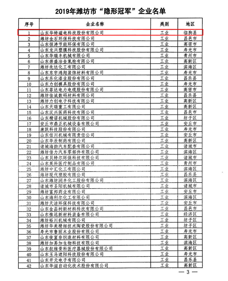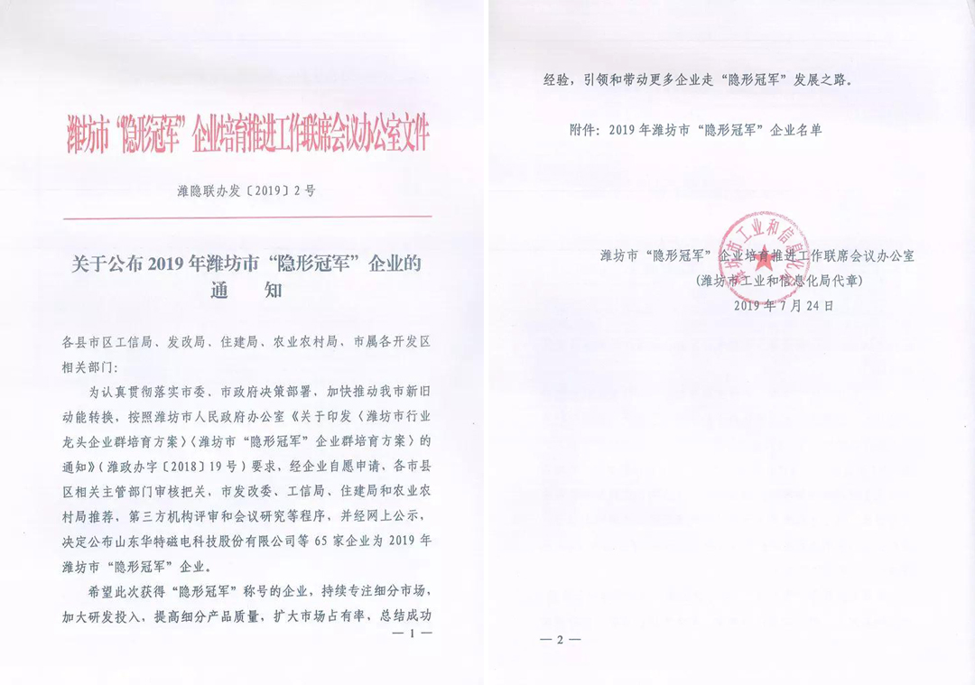 近日,濰坊市“隱形冠軍”企業(yè)培育推進(jìn)工作聯(lián)席會(huì)議辦公室以濰隱聯(lián)辦發(fā)﹝2019﹞2號(hào)文件《關(guān)于公布2019年濰坊市“隱形冠軍”企業(yè)的通知》,山東華特磁電科技股份有限公司被認(rèn)定為市級(jí)“隱形冠軍”企業(yè)。根據(jù)《濰坊市“隱形冠軍”企業(yè)群培育方案》(濰政辦字﹝2018﹞19號(hào)),公司將獲得市財(cái)政一次性獎(jiǎng)勵(lì)50萬元。